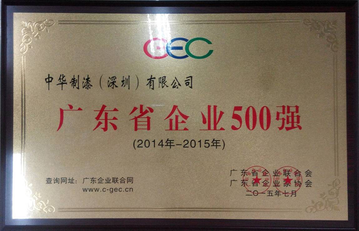 2015年7月31日,由广东省企业联合会、广东省企业家协会举办的2015年广东省企业500强、优秀自主品牌发布会在广州白云国际会议中心隆重举行,中华制漆(深圳)有限公司再次荣获“广东省企业500强”荣誉称号。